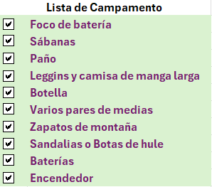 Puedes encontrar una lista en formato de excel para que organices tus cosas. Recuerda empacar todo en bolsas plásticas dentro de la mochila para proteger tus cosas de la humedad o bien de la lluvia.
